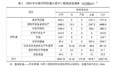 據統計,2004年中國各類來源的PCDD/Fs 的排放總量為10.2 kg I-TEQ(見表1),其中向空氣排放5.0 kg I-TEQ,向水體中排放了0.041 kg I-TEQ,通過產品排放0.17 kg I-TEQ,向土壤中排放了5.0 kg I-TEQ。在所有排放源中,金屬冶煉排放二噁英的量最大,占45.6 %,其次是發電和供熱,第三是廢物焚燒,這三類源排放量合計占到了總排放量的81 %。大氣環境中的二噁英來源復雜,主要產生于鋼鐵冶煉、有色金屬冶煉、汽車尾氣、焚燒生產(包括醫藥廢水焚燒、化工廠的廢物焚燒、生活垃圾焚燒、燃煤電廠等)等過程。