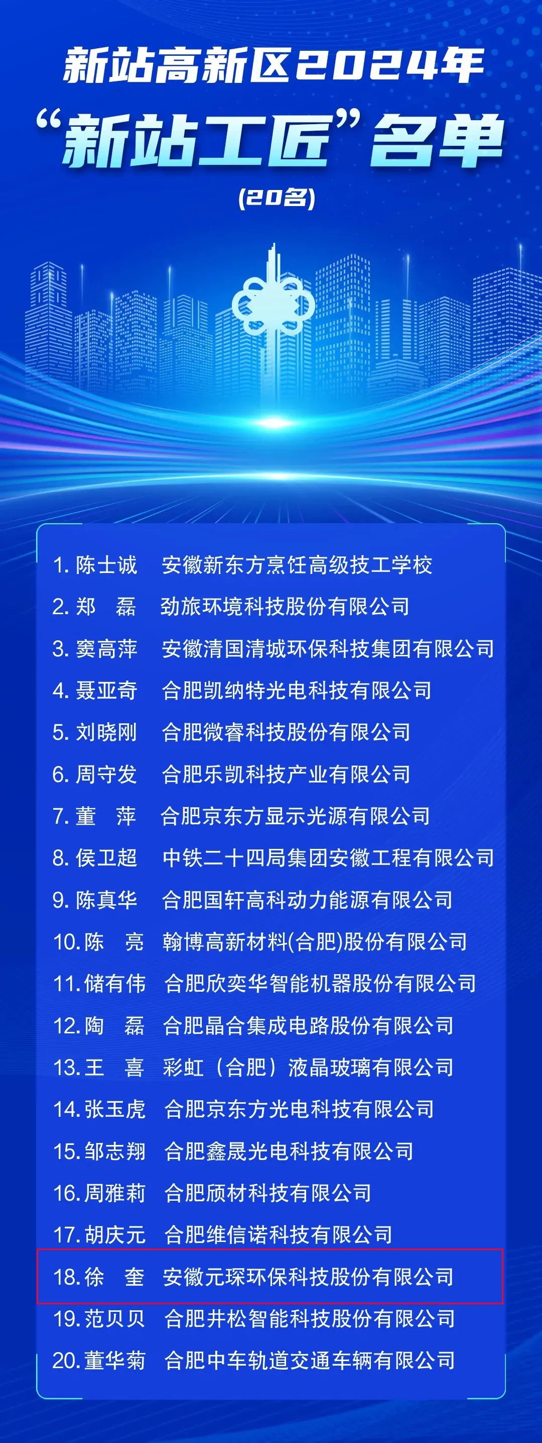 喜報(bào)!喜報(bào)!2024年“新站工匠”名單揭曉安徽元琛環(huán)??萍脊煞萦邢薰拘炜晒ι习?!